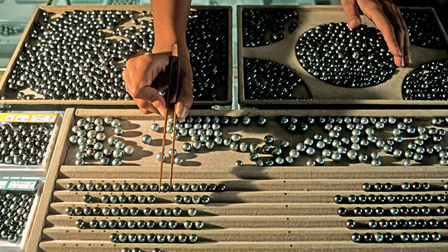 진주 상인은 크기와 색상 등의 특징에 따라 타히티 진주를 분류하여 어울리는 목걸이로 만들고 있습니다.